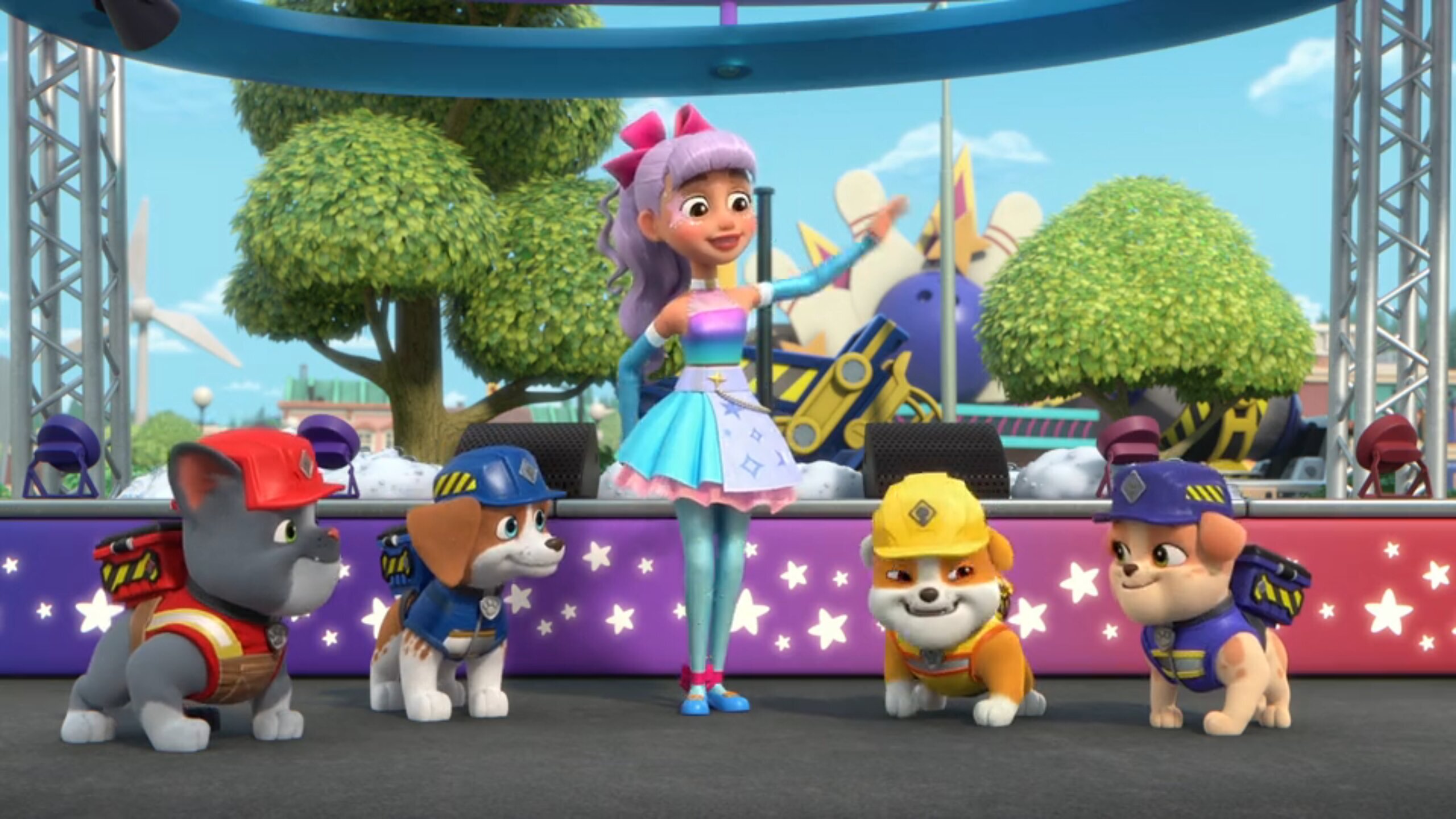 Gourmet Gabriel plant einen Bananen-Tag und benötigt die Hilfe von Rubble und Crew, um Frieda Funkels Bühne für ihr Konzert zu platzieren. Die Baupfoten versuchen zunächst, die Bühne vor der Auto-Waschanlage und beim Kaninchen-Ball-Golf aufzustellen, doch beide Orte sind ungeeignet. Schließlich findet die Bühne auf dem Dach von Gabriels Geschäft ihren Platz, sodass Frieda ihr Konzert geben kann und der Bananen-Tag gerettet ist.